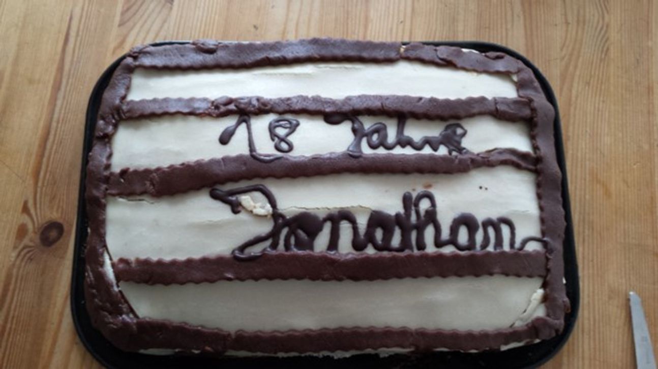 Zum 18. Geburtstag meines Sohnes habe ich diesen, seinen Lieblingskuchen, Bananenkuchen in einer eckigen Form, mit Marzipan umhüllt, gebacken.
